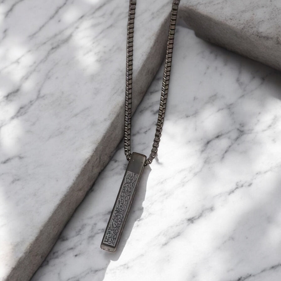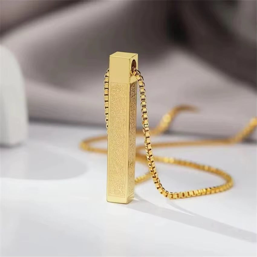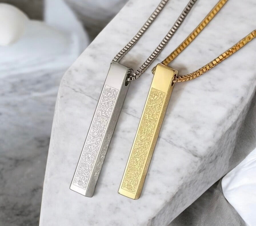 Elegant, minimalist, and meaningful! the Ayatul Kursi Bar Necklace is a beautiful way to carry the blessings and protection of the sacred Ayatul Kursi with you every day. This sleek design features the verse engraved on a slim bar pendant, perfect for layering or wearing as a statement piece.