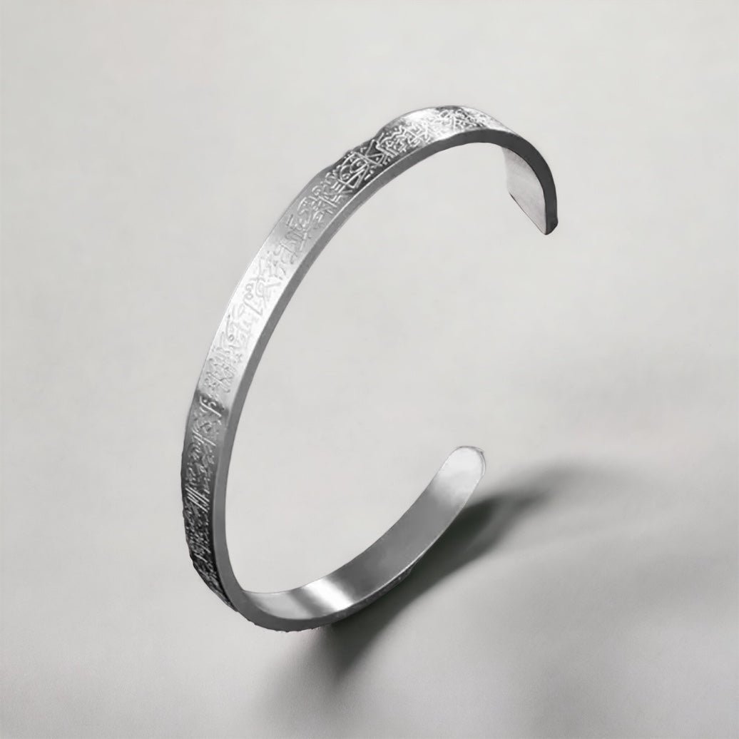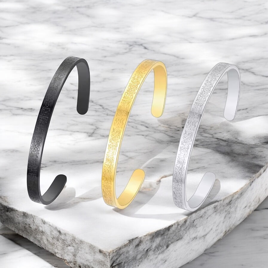 Timeless elegance meets spiritual significance with our Classic Ayatul Kursi Cuff. Available in Gold, Black, and Silver finishes, this adjustable cuff is designed to fit comfortably on any wrist while making a bold statement. The intricate engraving of Ayatul Kursi adds a meaningful touch, allowing you to carry blessings and protection with you every day.