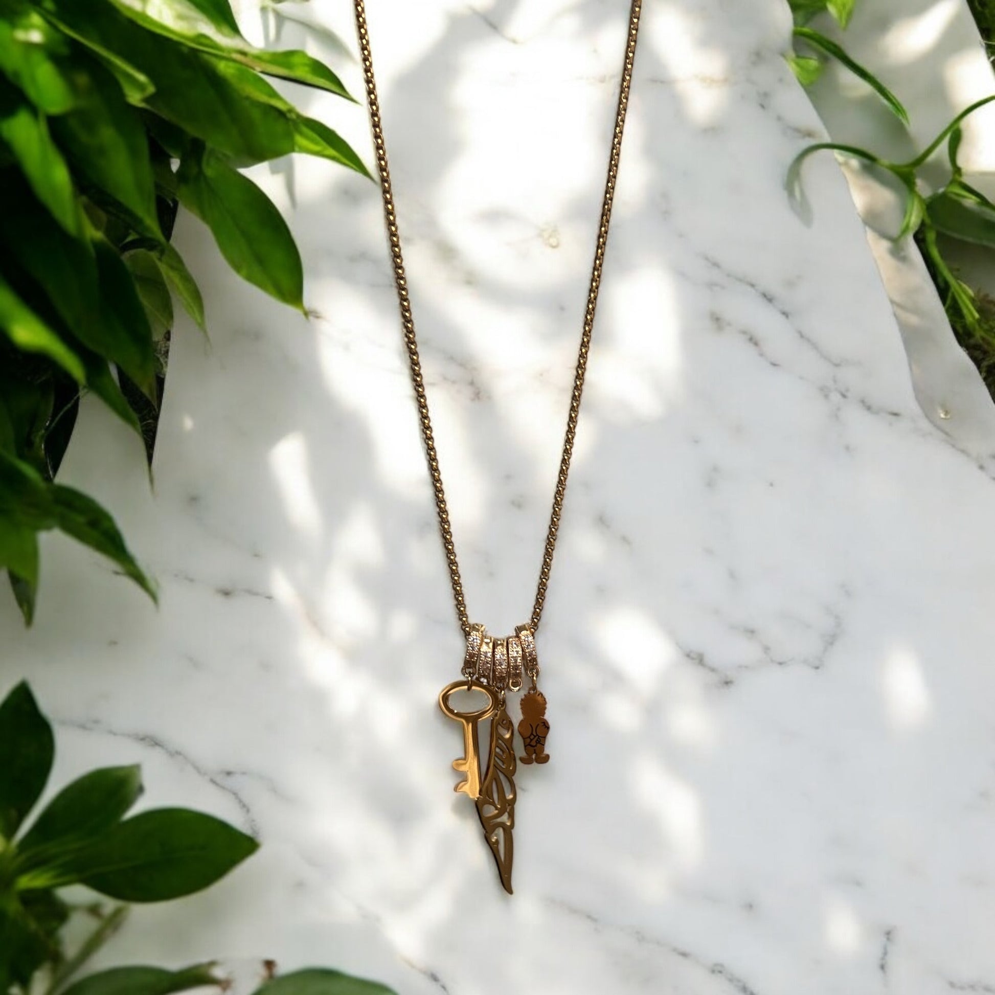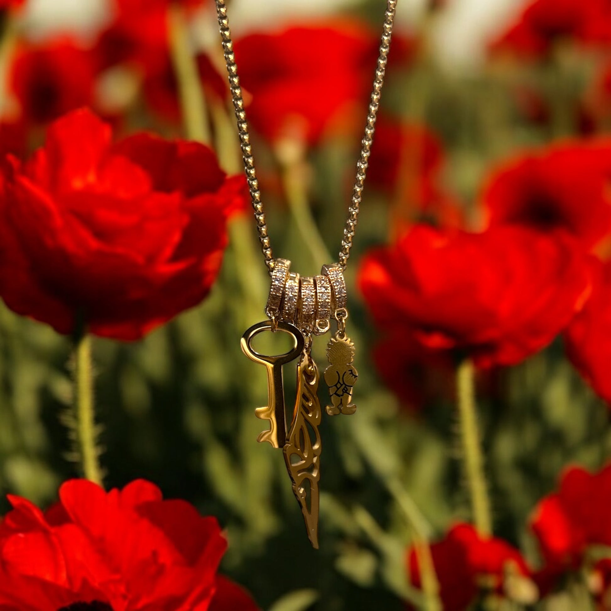 Our Palestine Charm Necklace is a gold-plated stainless steel piece that brings together three powerful symbols of heritage and resistance: