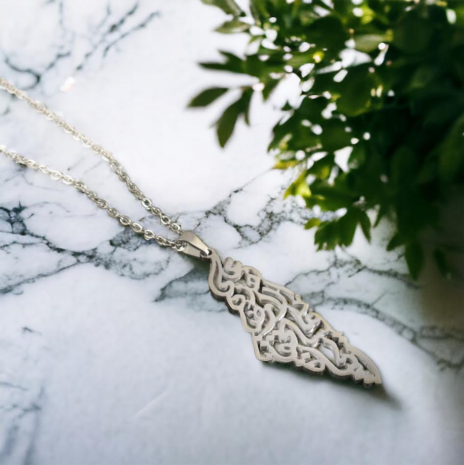 Wear the words of resilience, beauty, and hope with our "On This Land" Calligraphy Necklace, inspired by the powerful poetry of the renowned Palestinian poet Mahmoud Darwish. Engraved in elegant Arabic calligraphy, the phrase "على هذه الأرض ما يستحق الحياة" ("On this land, there is that which deserves life") is a tribute to the enduring spirit of Palestine and its people.