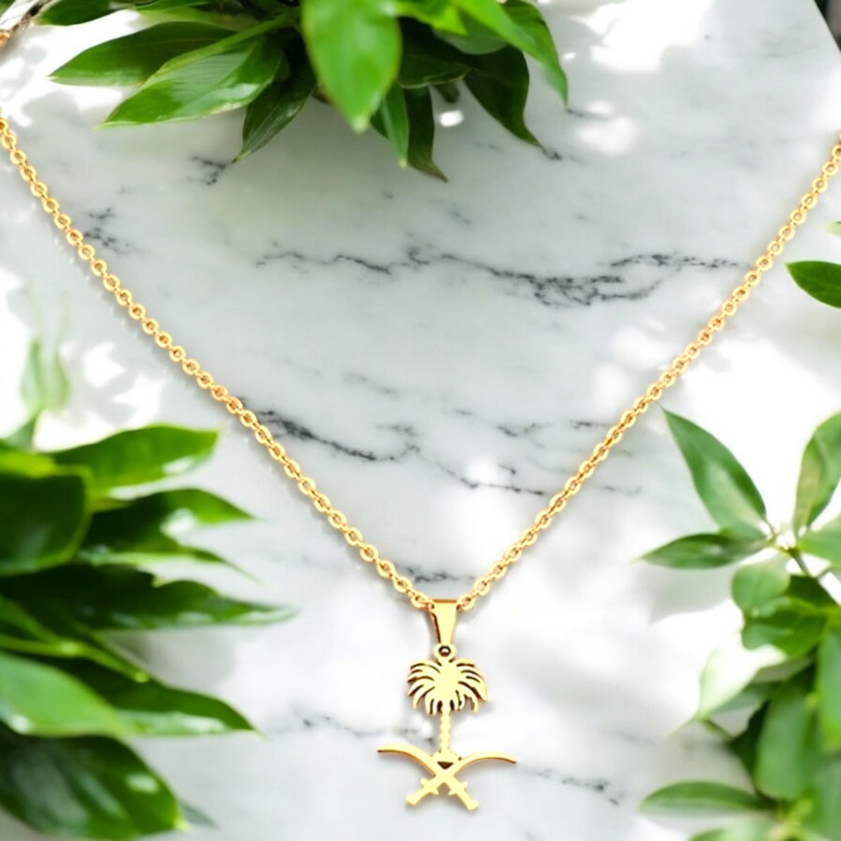 The Saudi Palm & Sword Necklace features the iconic symbol of Saudi Arabia: a graceful palm tree resting above two crossed swords. Together, they represent prosperity, justice, and national pride, where the palm symbolizes vitality and growth, and the swords represent strength and protection.